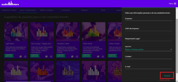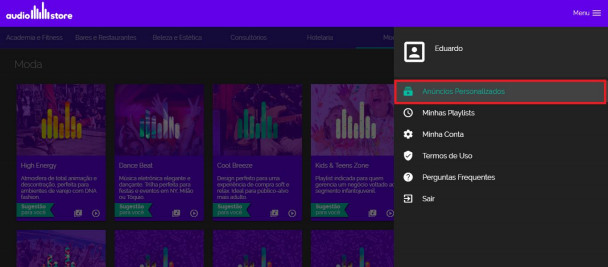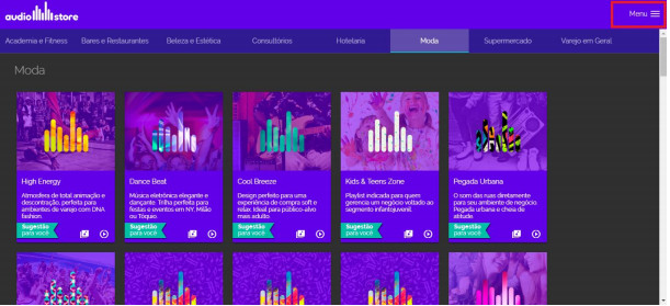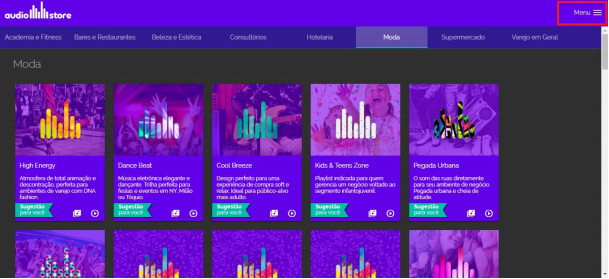 1- Ao acessar sua rádio no sistema Audiostore Free (clique aqui para ver como acessar), você terá muitas opções de playlists para escolher. Basta você selecionar o segmento da sua empresa, para abrir as playlists recomendadas para tal: