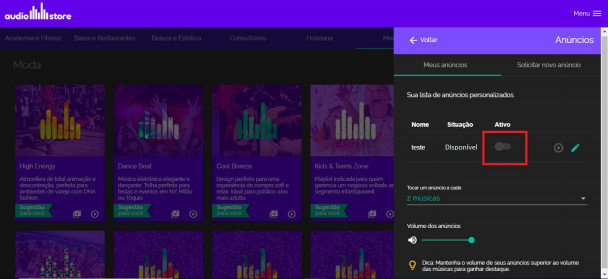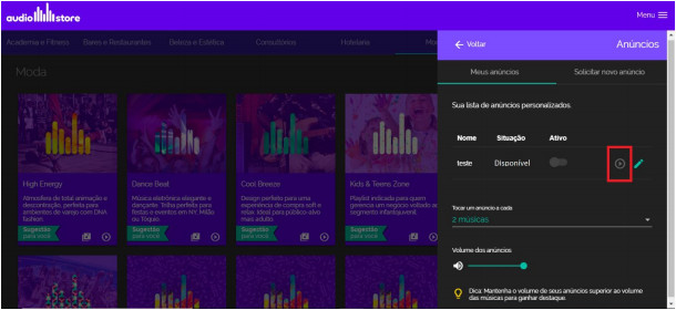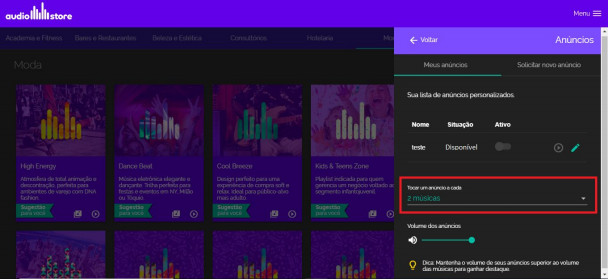 7- Você gostou do anúncio, então é só ativá-lo. Antes, verifique em qual sequência de intervalos de músicas você deseja que ele seja tocado na rua rádio, para isso selecione uma das opções dentro de “Tocar um anúncio a cada”, veja abaixo: