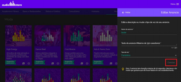 4- O primeiro passo, você deverá escutar o seu anúncio, para isso clique no botão de player como mostra abaixo: